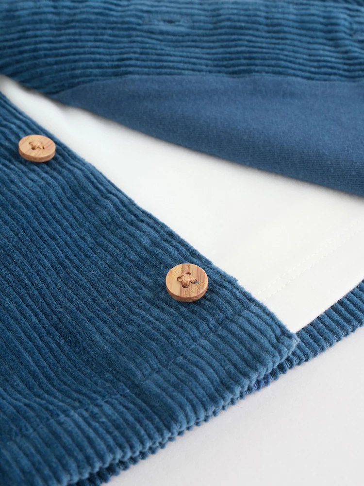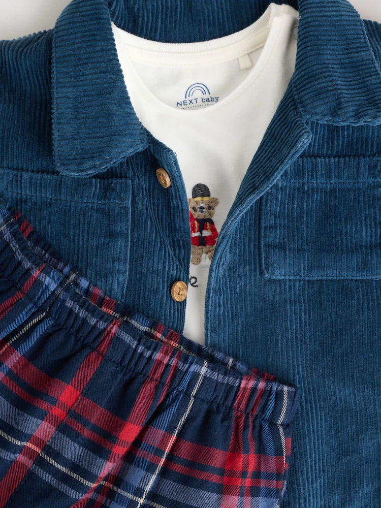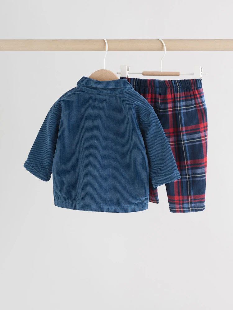 Keep your little one cosy and stylish with this trendy three-piece set. The navy cord-style shacket features button fastening and front pockets for a smart layered look, paired perfectly with red and navy check leggings and shirt for a playful finish.