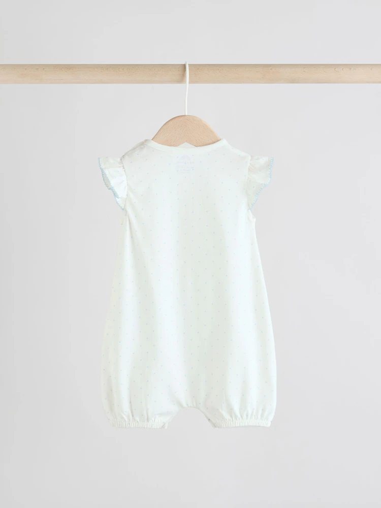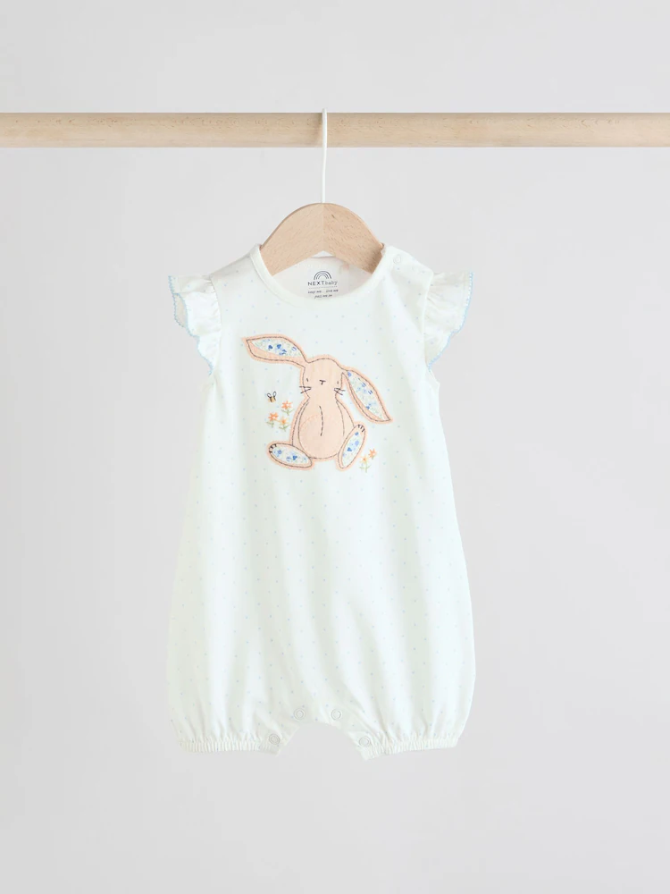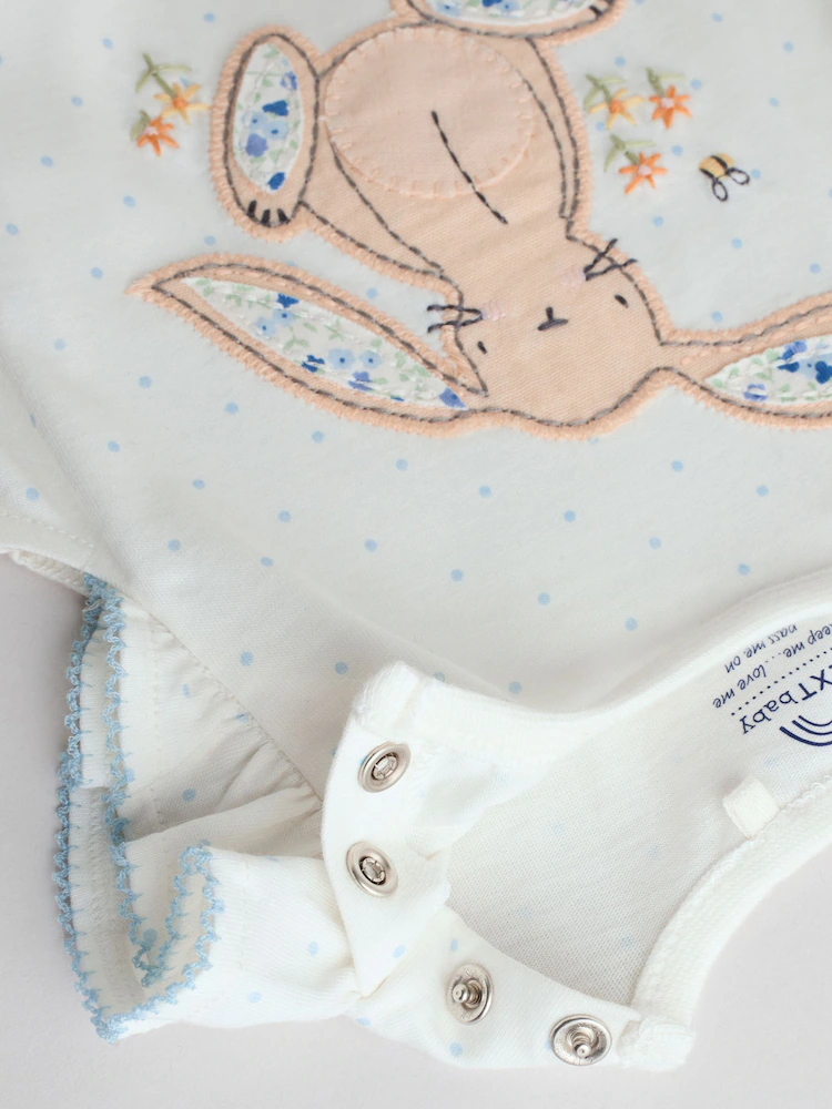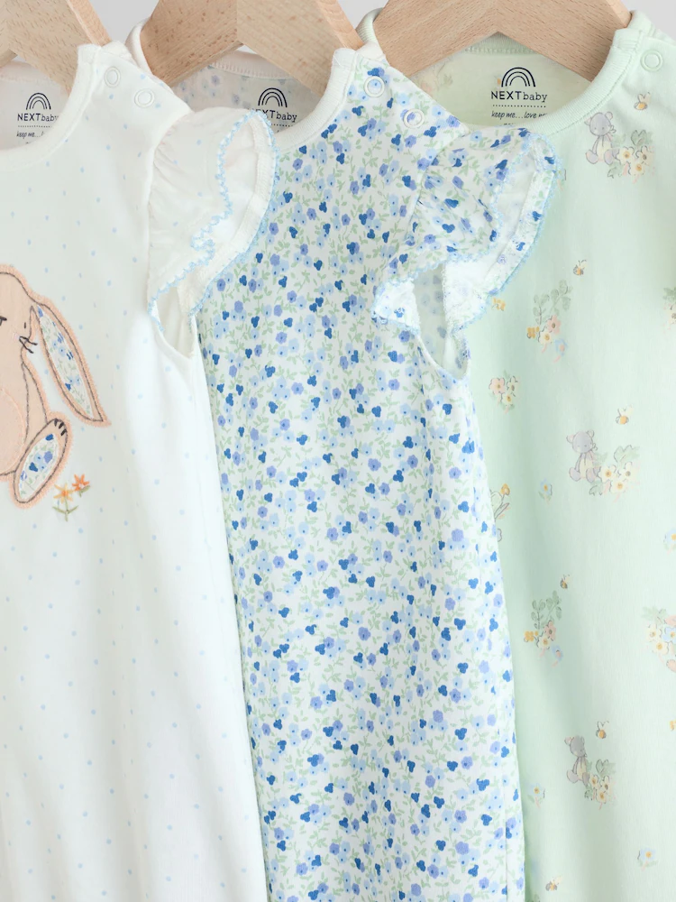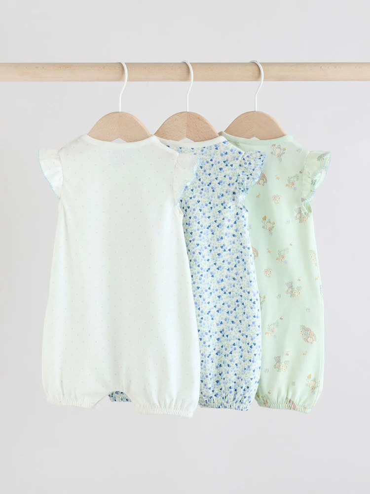 This 3-pack of baby rompers are made from pure cotton, featuring all-over floral, bunny and springtime prints, finished with frill detailing to the shoulders and a popper leg opening for easy wear.